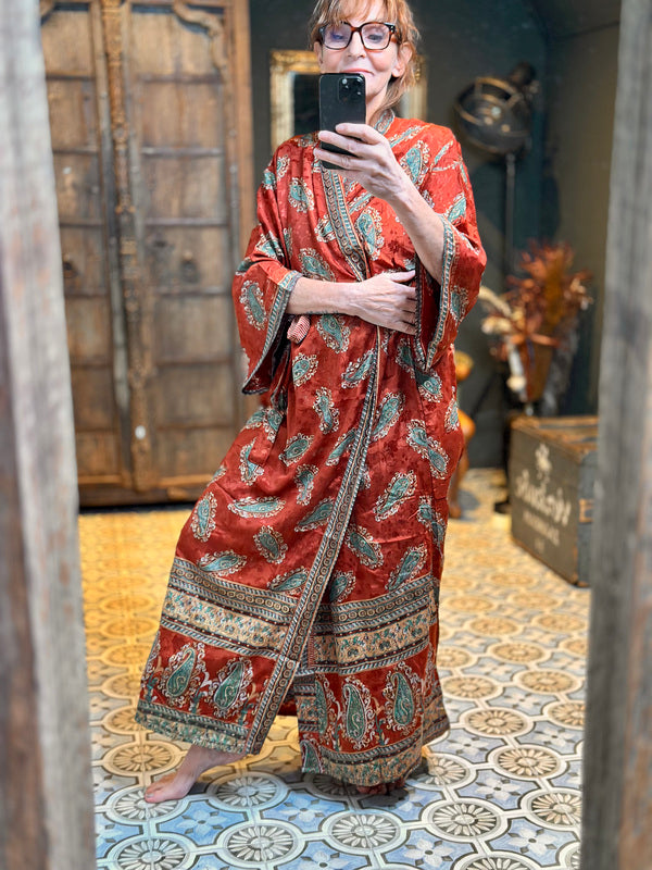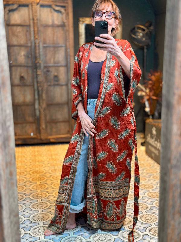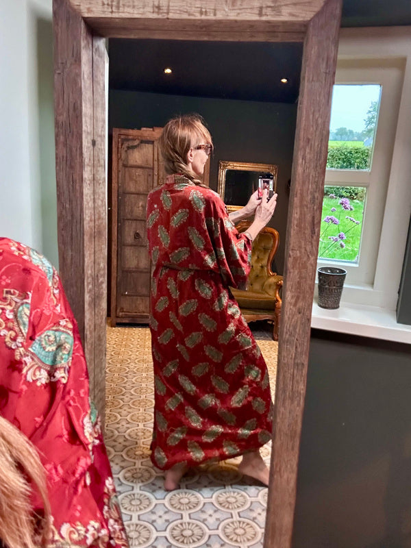 Wat deze kimono echt bijzonder maakt, is het gebruik van upcycled Sari zijde, gecombineerd met andere uitzonderlijk mooie stoffen. Dit betekent dat elke kimono een uniek meesterwerk is, met zijn eigen karakter en verhaal. Bij TwoSisters geloven we in duurzaamheid en het creëren van iets moois uit hergebruikte materialen. Met deze kimono draag je niet alleen een prachtig kledingstuk, maar ook een stukje ethische mode.