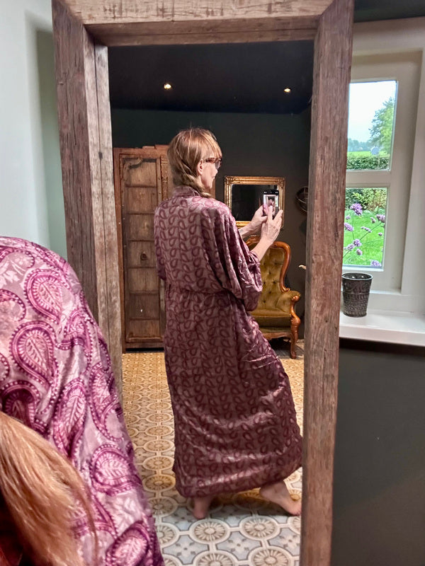 Wat deze kimono echt bijzonder maakt, is het gebruik van upcycled Sari zijde, gecombineerd met andere uitzonderlijk mooie stoffen. Dit betekent dat elke kimono een uniek meesterwerk is, met zijn eigen karakter en verhaal. Bij TwoSisters geloven we in duurzaamheid en het creëren van iets moois uit hergebruikte materialen. Met deze kimono draag je niet alleen een prachtig kledingstuk, maar ook een stukje ethische mode.