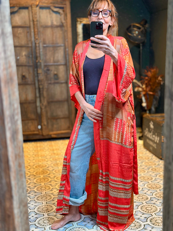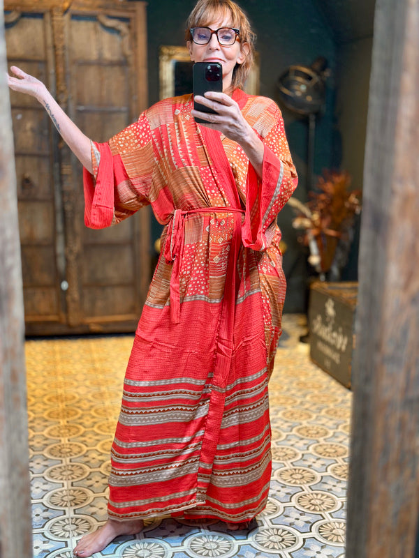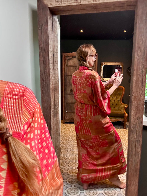Wat deze kimono echt bijzonder maakt, is het gebruik van upcycled Sari zijde, gecombineerd met andere uitzonderlijk mooie stoffen. Dit betekent dat elke kimono een uniek meesterwerk is, met zijn eigen karakter en verhaal. Bij TwoSisters geloven we in duurzaamheid en het creëren van iets moois uit hergebruikte materialen. Met deze kimono draag je niet alleen een prachtig kledingstuk, maar ook een stukje ethische mode.
