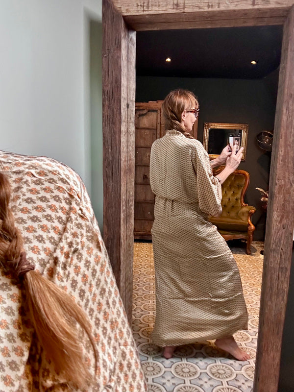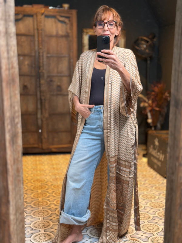 Wat deze kimono echt bijzonder maakt, is het gebruik van upcycled Sari zijde, gecombineerd met andere uitzonderlijk mooie stoffen. Dit betekent dat elke kimono een uniek meesterwerk is, met zijn eigen karakter en verhaal. Bij TwoSisters geloven we in duurzaamheid en het creëren van iets moois uit hergebruikte materialen. Met deze kimono draag je niet alleen een prachtig kledingstuk, maar ook een stukje ethische mode.