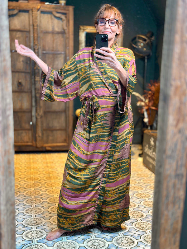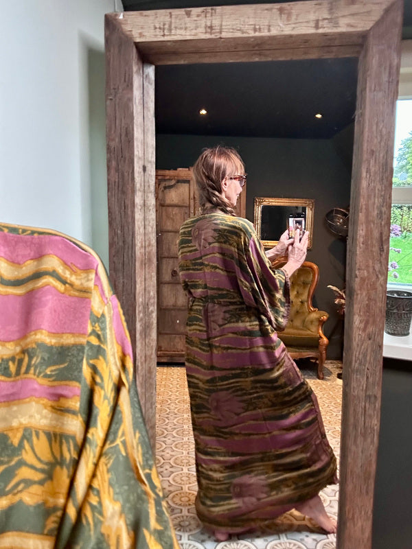 Wat deze kimono echt bijzonder maakt, is het gebruik van upcycled Sari zijde, gecombineerd met andere uitzonderlijk mooie stoffen. Dit betekent dat elke kimono een uniek meesterwerk is, met zijn eigen karakter en verhaal. Bij TwoSisters geloven we in duurzaamheid en het creëren van iets moois uit hergebruikte materialen. Met deze kimono draag je niet alleen een prachtig kledingstuk, maar ook een stukje ethische mode.