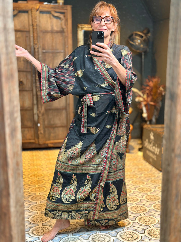 Wat deze kimono echt bijzonder maakt, is het gebruik van upcycled Sari zijde, gecombineerd met andere uitzonderlijk mooie stoffen. Dit betekent dat elke kimono een uniek meesterwerk is, met zijn eigen karakter en verhaal. Bij TwoSisters geloven we in duurzaamheid en het creëren van iets moois uit hergebruikte materialen. Met deze kimono draag je niet alleen een prachtig kledingstuk, maar ook een stukje ethische mode.