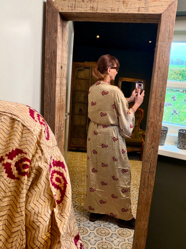 Wat deze kimono echt bijzonder maakt, is het gebruik van upcycled Sari zijde, gecombineerd met andere uitzonderlijk mooie stoffen. Dit betekent dat elke kimono een uniek meesterwerk is, met zijn eigen karakter en verhaal. Bij TwoSisters geloven we in duurzaamheid en het creëren van iets moois uit hergebruikte materialen. Met deze kimono draag je niet alleen een prachtig kledingstuk, maar ook een stukje ethische mode.