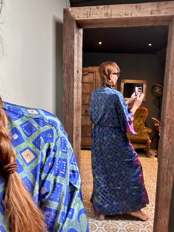 Wat deze kimono echt bijzonder maakt, is het gebruik van upcycled Sari zijde, gecombineerd met andere uitzonderlijk mooie stoffen. Dit betekent dat elke kimono een uniek meesterwerk is, met zijn eigen karakter en verhaal. Bij TwoSisters geloven we in duurzaamheid en het creëren van iets moois uit hergebruikte materialen. Met deze kimono draag je niet alleen een prachtig kledingstuk, maar ook een stukje ethische mode.