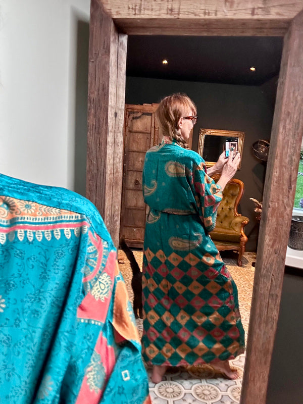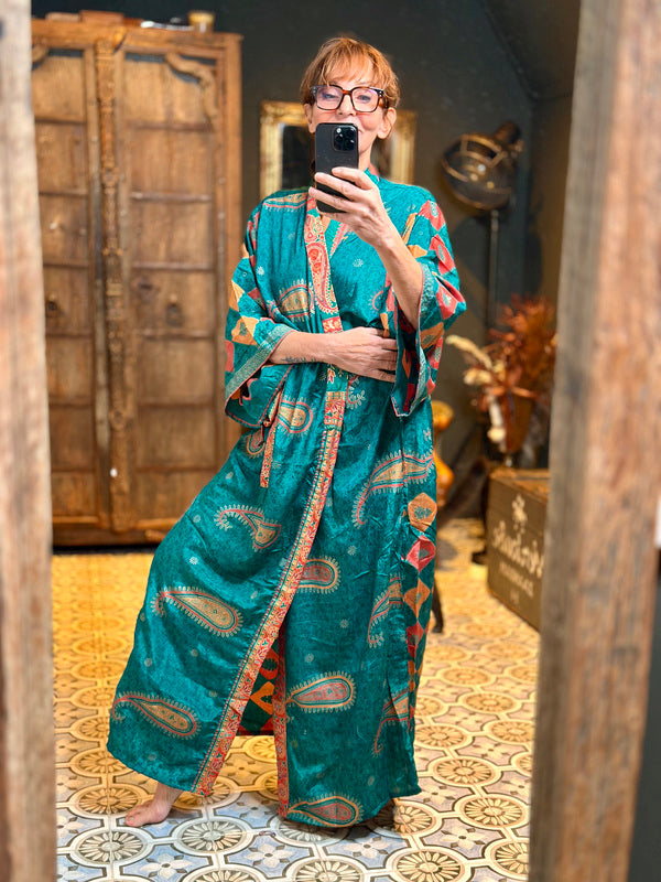 Wat deze kimono echt bijzonder maakt, is het gebruik van upcycled Sari zijde, gecombineerd met andere uitzonderlijk mooie stoffen. Dit betekent dat elke kimono een uniek meesterwerk is, met zijn eigen karakter en verhaal. Bij TwoSisters geloven we in duurzaamheid en het creëren van iets moois uit hergebruikte materialen. Met deze kimono draag je niet alleen een prachtig kledingstuk, maar ook een stukje ethische mode.