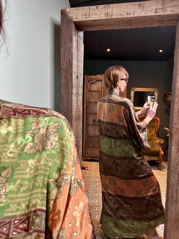 Wat deze kimono echt bijzonder maakt, is het gebruik van upcycled Sari zijde, gecombineerd met andere uitzonderlijk mooie stoffen. Dit betekent dat elke kimono een uniek meesterwerk is, met zijn eigen karakter en verhaal. Bij TwoSisters geloven we in duurzaamheid en het creëren van iets moois uit hergebruikte materialen. Met deze kimono draag je niet alleen een prachtig kledingstuk, maar ook een stukje ethische mode.