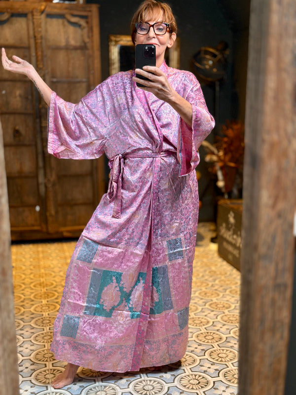 Wat deze kimono echt bijzonder maakt, is het gebruik van upcycled Sari zijde, gecombineerd met andere uitzonderlijk mooie stoffen. Dit betekent dat elke kimono een uniek meesterwerk is, met zijn eigen karakter en verhaal. Bij TwoSisters geloven we in duurzaamheid en het creëren van iets moois uit hergebruikte materialen. Met deze kimono draag je niet alleen een prachtig kledingstuk, maar ook een stukje ethische mode.