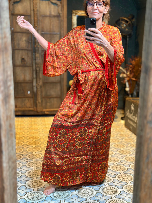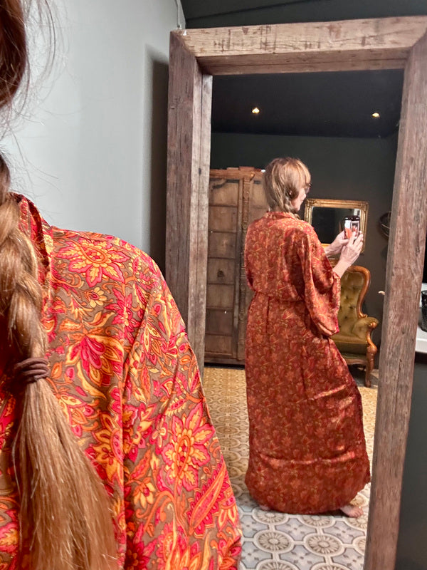 Wat deze kimono echt bijzonder maakt, is het gebruik van upcycled Sari zijde, gecombineerd met andere uitzonderlijk mooie stoffen. Dit betekent dat elke kimono een uniek meesterwerk is, met zijn eigen karakter en verhaal. Bij TwoSisters geloven we in duurzaamheid en het creëren van iets moois uit hergebruikte materialen. Met deze kimono draag je niet alleen een prachtig kledingstuk, maar ook een stukje ethische mode.