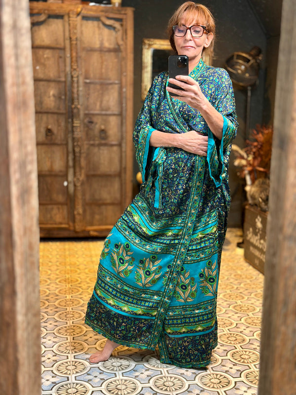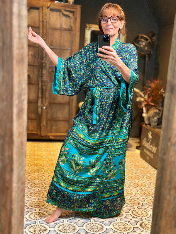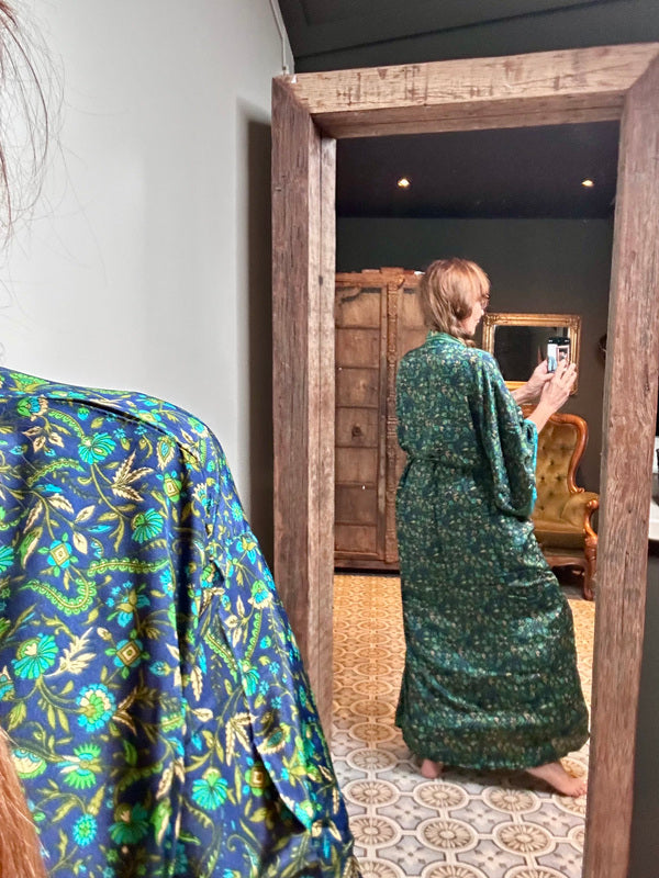 Wat deze kimono echt bijzonder maakt, is het gebruik van upcycled Sari zijde, gecombineerd met andere uitzonderlijk mooie stoffen. Dit betekent dat elke kimono een uniek meesterwerk is, met zijn eigen karakter en verhaal. Bij TwoSisters geloven we in duurzaamheid en het creëren van iets moois uit hergebruikte materialen. Met deze kimono draag je niet alleen een prachtig kledingstuk, maar ook een stukje ethische mode.