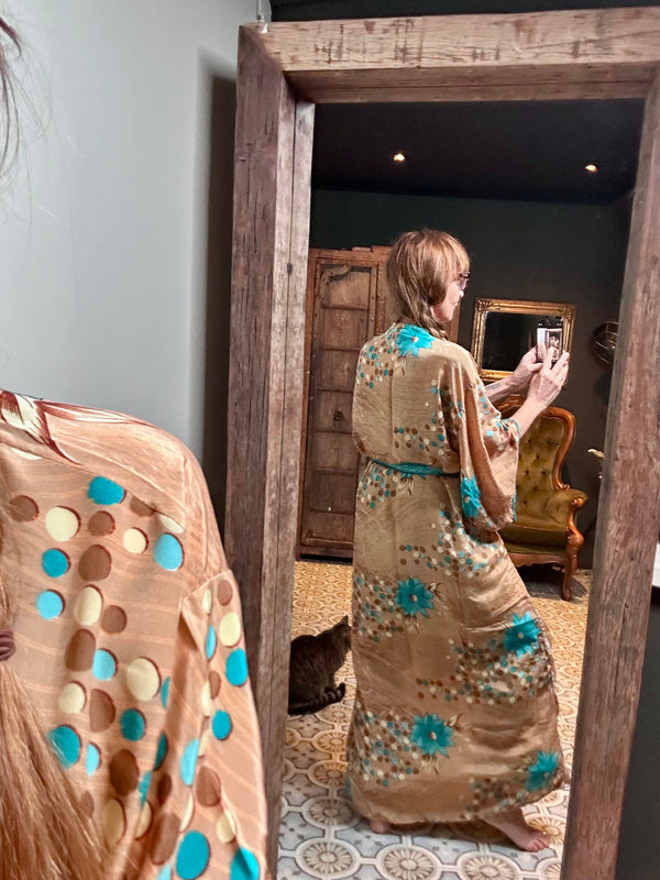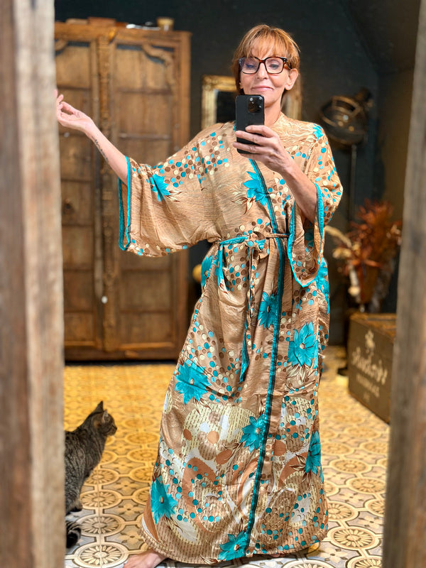 Wat deze kimono echt bijzonder maakt, is het gebruik van upcycled Sari zijde, gecombineerd met andere uitzonderlijk mooie stoffen. Dit betekent dat elke kimono een uniek meesterwerk is, met zijn eigen karakter en verhaal. Bij TwoSisters geloven we in duurzaamheid en het creëren van iets moois uit hergebruikte materialen. Met deze kimono draag je niet alleen een prachtig kledingstuk, maar ook een stukje ethische mode.