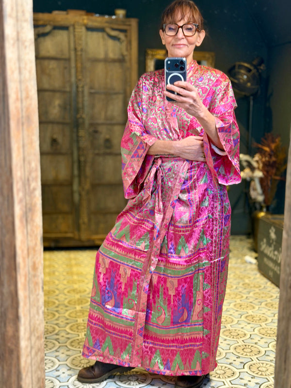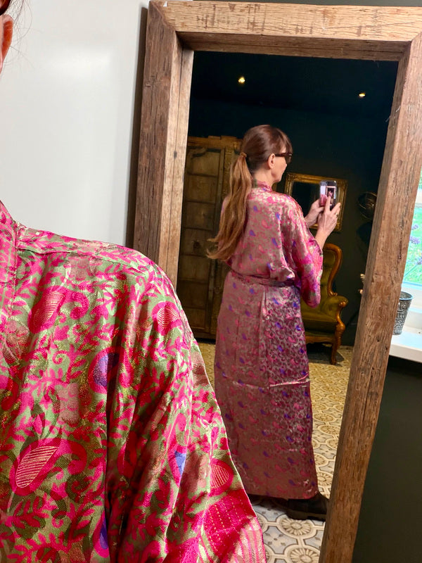 Wat deze kimono echt bijzonder maakt, is het gebruik van upcycled Sari zijde, gecombineerd met andere uitzonderlijk mooie stoffen. Dit betekent dat elke kimono een uniek meesterwerk is, met zijn eigen karakter en verhaal. Bij TwoSisters geloven we in duurzaamheid en het creëren van iets moois uit hergebruikte materialen. Met deze kimono draag je niet alleen een prachtig kledingstuk, maar ook een stukje ethische mode.