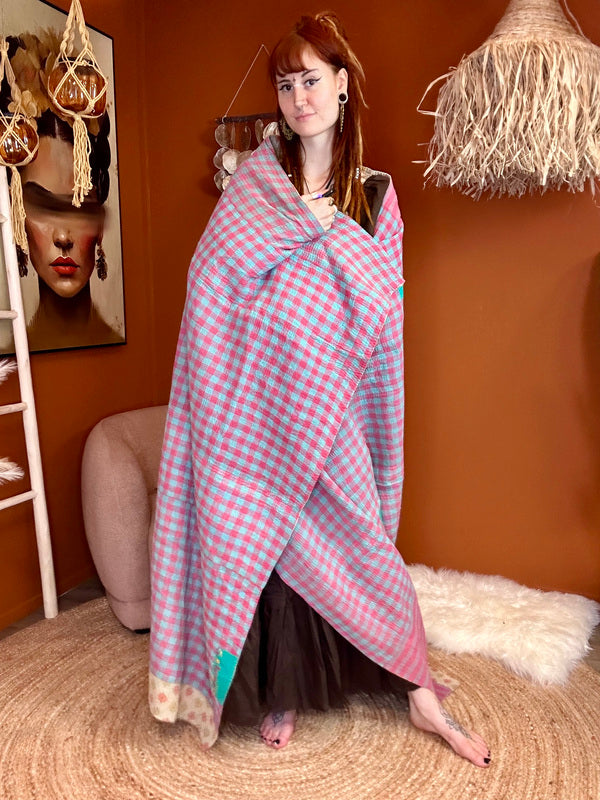 Onze Kantha Quilt Deken is een waar kunstwerk vol liefde, vakmanschap en geschiedenis. Deze bijzondere dekens worden met de hand gemaakt van gerecyclede katoenen sari’s. Drie lagen vintage stof worden met duizenden fijne Kantha-steken aan elkaar geborduurd – een eeuwenoude techniek uit India die elke quilt haar eigen ziel geeft.
