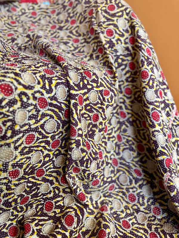 Omdat deze quilts worden gemaakt van gerecyclede sari’s, kan er soms een klein vlekje, stikseltje of kleurverschil zichtbaar zijn. Dit zijn geen fouten, maar sporen van een leven dat de stof al eerder heeft geleefd. Ze maken jouw quilt juist écht uniek en dragen bij aan de charme en authenticiteit die je alleen bij handgemaakte items vindt.