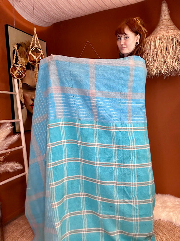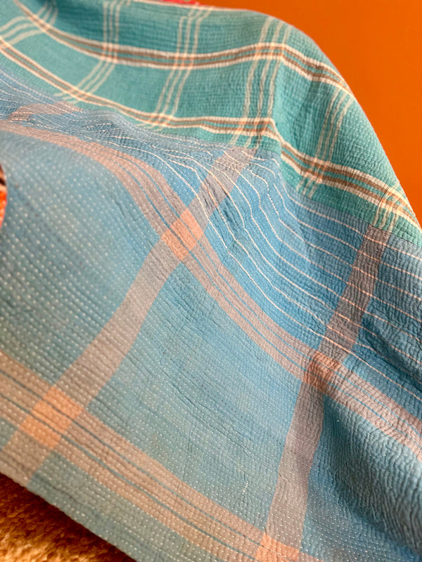 Onze Kantha Quilt Deken is een waar kunstwerk vol liefde, vakmanschap en geschiedenis. Deze bijzondere dekens worden met de hand gemaakt van gerecyclede katoenen sari’s. Drie lagen vintage stof worden met duizenden fijne Kantha-steken aan elkaar geborduurd – een eeuwenoude techniek uit India die elke quilt haar eigen ziel geeft.