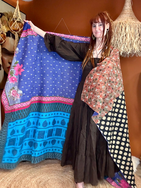 Onze Kantha Quilt Deken is een waar kunstwerk vol liefde, vakmanschap en geschiedenis. Deze bijzondere dekens worden met de hand gemaakt van gerecyclede katoenen sari’s. Drie lagen vintage stof worden met duizenden fijne Kantha-steken aan elkaar geborduurd – een eeuwenoude techniek uit India die elke quilt haar eigen ziel geeft.