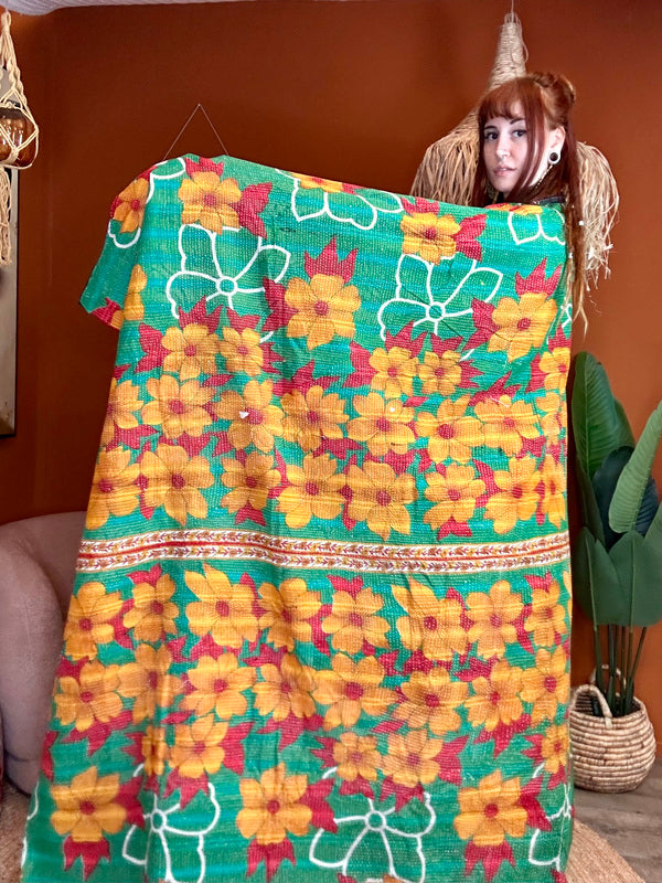 Onze Kantha Quilt Deken is een waar kunstwerk vol liefde, vakmanschap en geschiedenis. Deze bijzondere dekens worden met de hand gemaakt van gerecyclede katoenen sari’s. Drie lagen vintage stof worden met duizenden fijne Kantha-steken aan elkaar geborduurd – een eeuwenoude techniek uit India die elke quilt haar eigen ziel geeft.