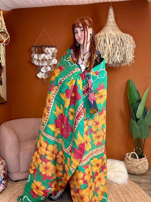 Een Kantha Quilt is niet alleen prachtig als bedsprei, plaid of bankkleed, maar ook een echte sfeermaker in huis. Drapeer hem nonchalant over je bank, aan het voeteneinde van je bed, of neem hem mee naar buiten voor een stijlvolle picknick – hij geeft overal een warme, bohemian touch.