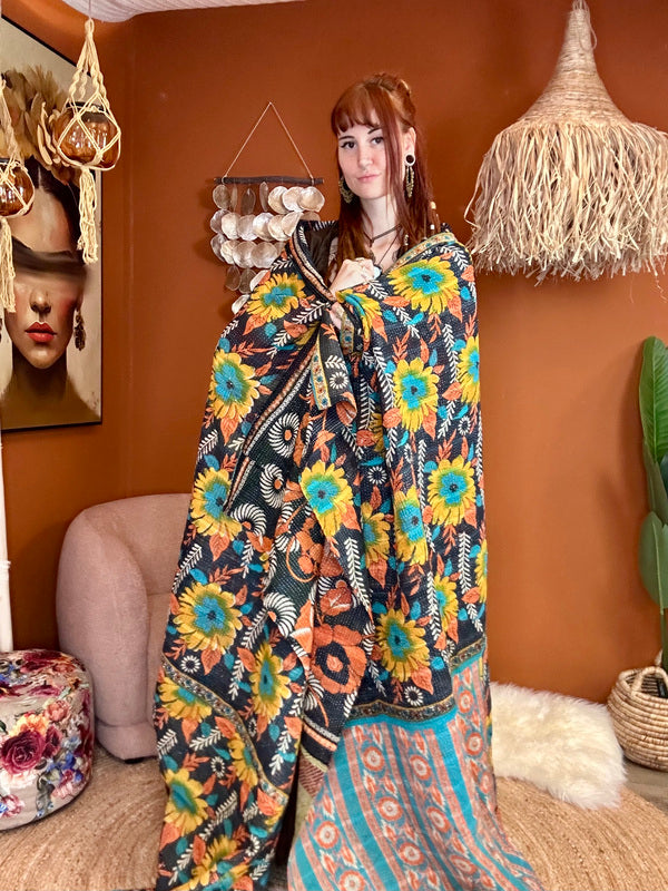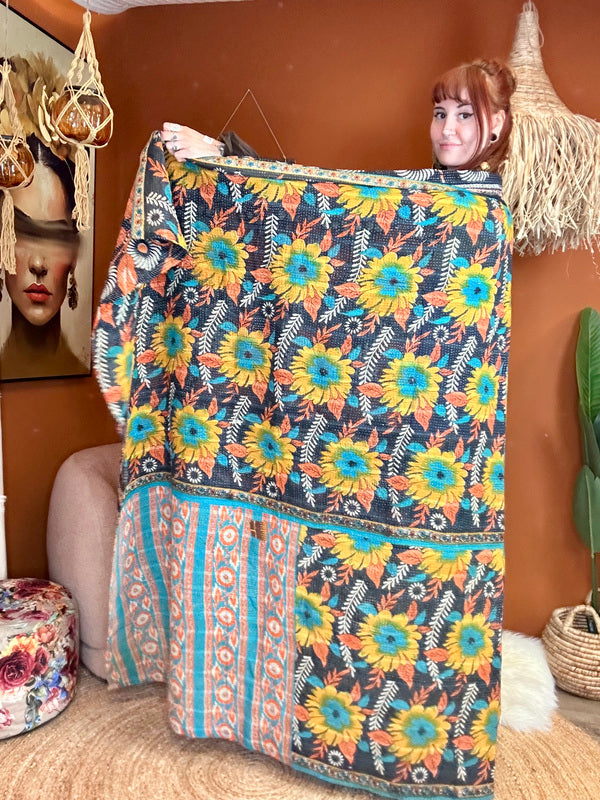 Een Kantha Quilt is niet alleen prachtig als bedsprei, plaid of bankkleed, maar ook een echte sfeermaker in huis. Drapeer hem nonchalant over je bank, aan het voeteneinde van je bed, of neem hem mee naar buiten voor een stijlvolle picknick – hij geeft overal een warme, bohemian touch.