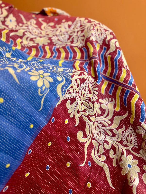 Onze Kantha Quilt Deken is een waar kunstwerk vol liefde, vakmanschap en geschiedenis. Deze bijzondere dekens worden met de hand gemaakt van gerecyclede katoenen sari’s. Drie lagen vintage stof worden met duizenden fijne Kantha-steken aan elkaar geborduurd – een eeuwenoude techniek uit India die elke quilt haar eigen ziel geeft.