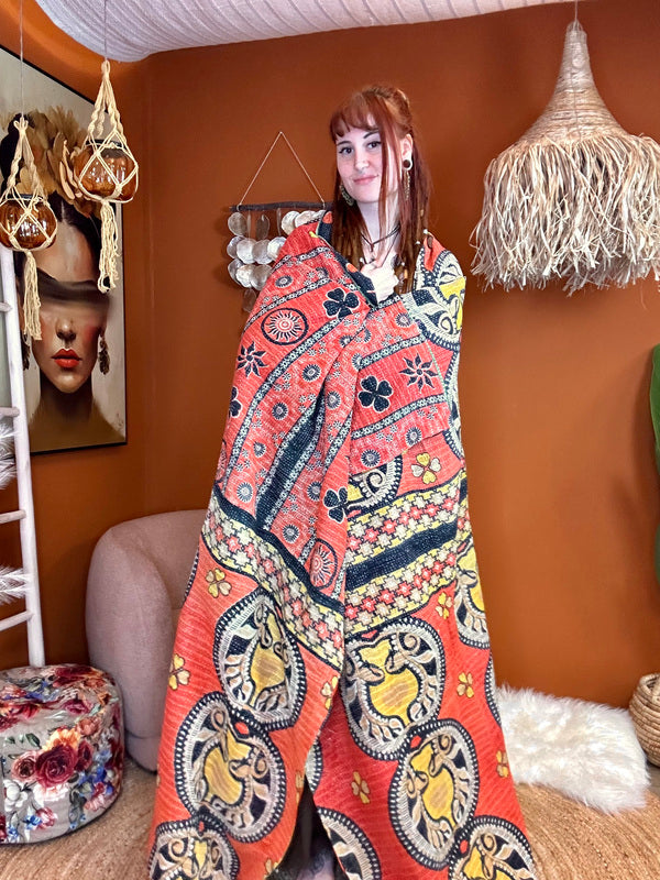 Een Kantha Quilt is niet alleen prachtig als bedsprei, plaid of bankkleed, maar ook een echte sfeermaker in huis. Drapeer hem nonchalant over je bank, aan het voeteneinde van je bed, of neem hem mee naar buiten voor een stijlvolle picknick – hij geeft overal een warme, bohemian touch.