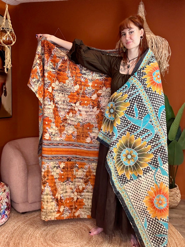 Omdat deze quilts worden gemaakt van gerecyclede sari’s, kan er soms een klein vlekje, stikseltje of kleurverschil zichtbaar zijn. Dit zijn geen fouten, maar sporen van een leven dat de stof al eerder heeft geleefd. Ze maken jouw quilt juist écht uniek en dragen bij aan de charme en authenticiteit die je alleen bij handgemaakte items vindt.