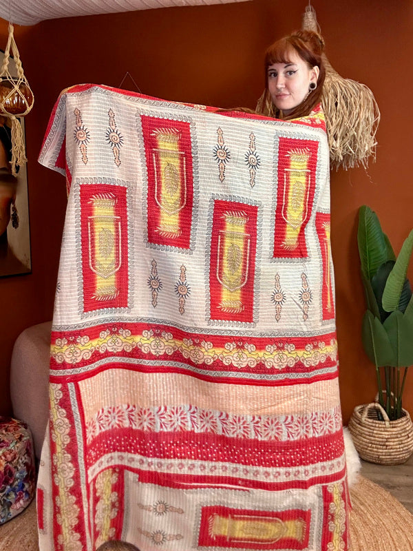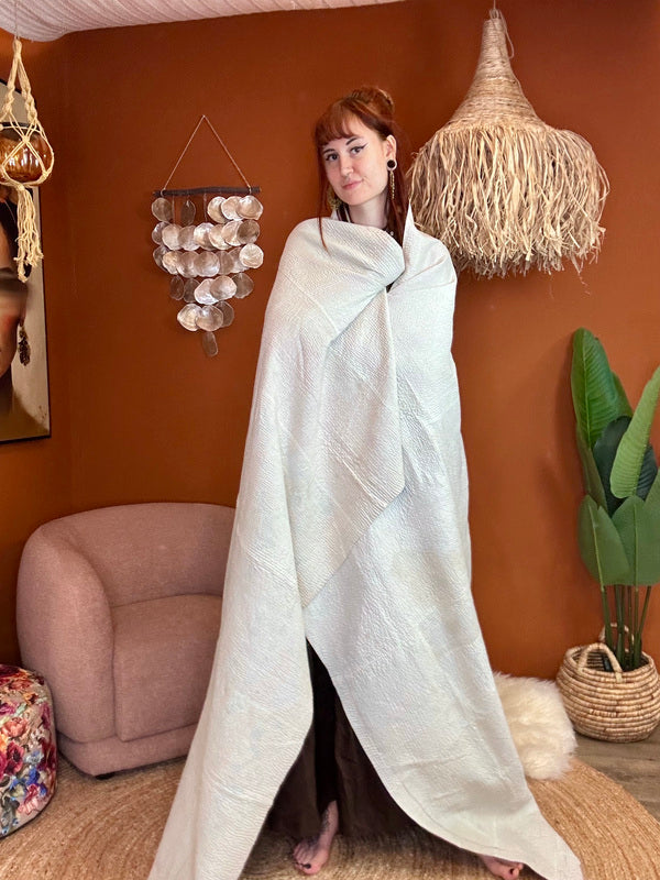 Onze Kantha Quilt Deken is een waar kunstwerk vol liefde, vakmanschap en geschiedenis. Deze bijzondere dekens worden met de hand gemaakt van gerecyclede katoenen sari’s. Drie lagen vintage stof worden met duizenden fijne Kantha-steken aan elkaar geborduurd – een eeuwenoude techniek uit India die elke quilt haar eigen ziel geeft.