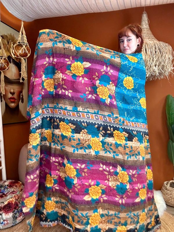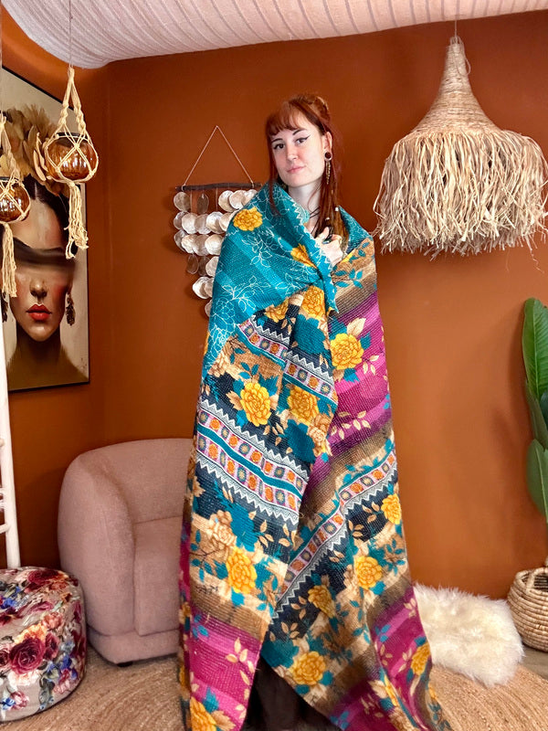 Een Kantha Quilt is niet alleen prachtig als bedsprei, plaid of bankkleed, maar ook een echte sfeermaker in huis. Drapeer hem nonchalant over je bank, aan het voeteneinde van je bed, of neem hem mee naar buiten voor een stijlvolle picknick – hij geeft overal een warme, bohemian touch.
