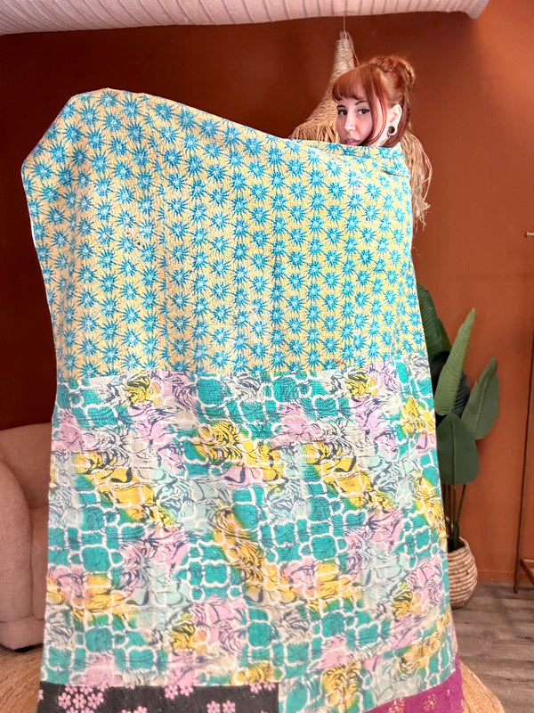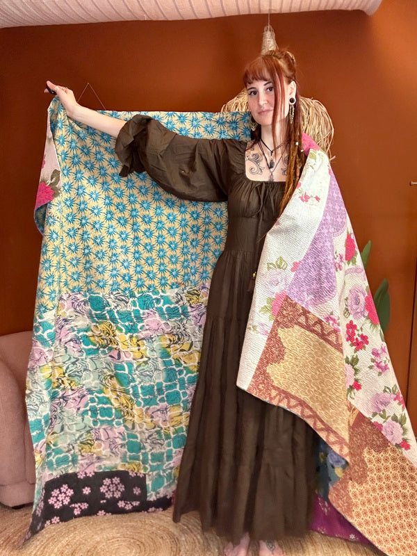Onze Kantha Quilt Deken is een waar kunstwerk vol liefde, vakmanschap en geschiedenis. Deze bijzondere dekens worden met de hand gemaakt van gerecyclede katoenen sari’s. Drie lagen vintage stof worden met duizenden fijne Kantha-steken aan elkaar geborduurd – een eeuwenoude techniek uit India die elke quilt haar eigen ziel geeft.