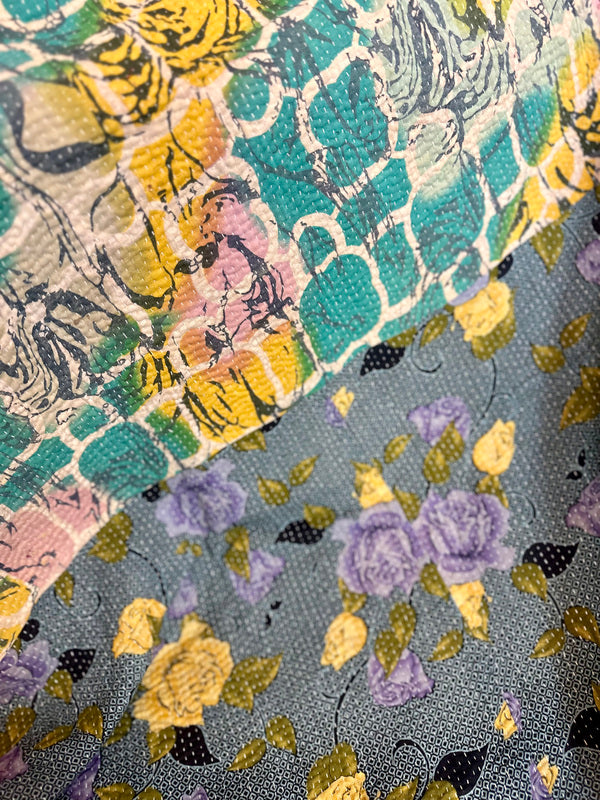 Omdat deze quilts worden gemaakt van gerecyclede sari’s, kan er soms een klein vlekje, stikseltje of kleurverschil zichtbaar zijn. Dit zijn geen fouten, maar sporen van een leven dat de stof al eerder heeft geleefd. Ze maken jouw quilt juist écht uniek en dragen bij aan de charme en authenticiteit die je alleen bij handgemaakte items vindt.