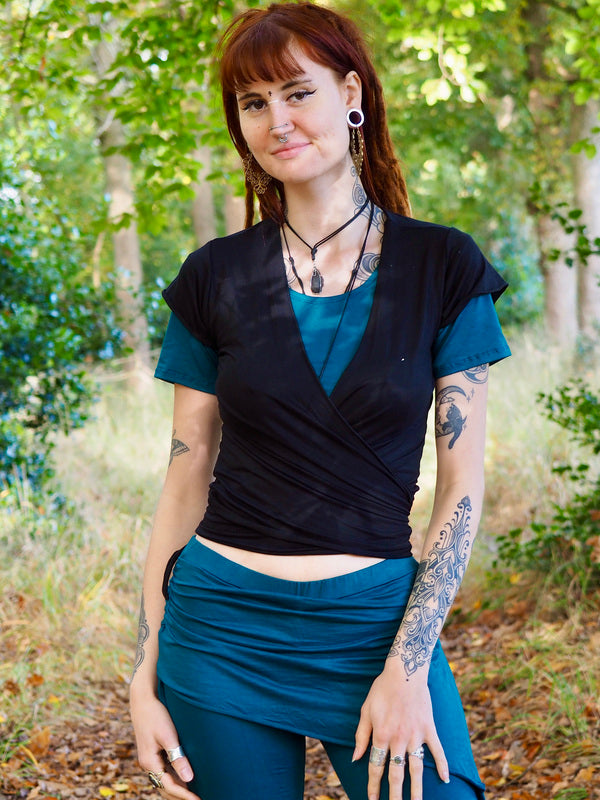 De Lakshmi Top – genoemd naar de godin van schoonheid en overvloed – is een verfijnd en vrouwelijk yoga vestje dat je zowel aan de voor- als achterkant kunt knopen.