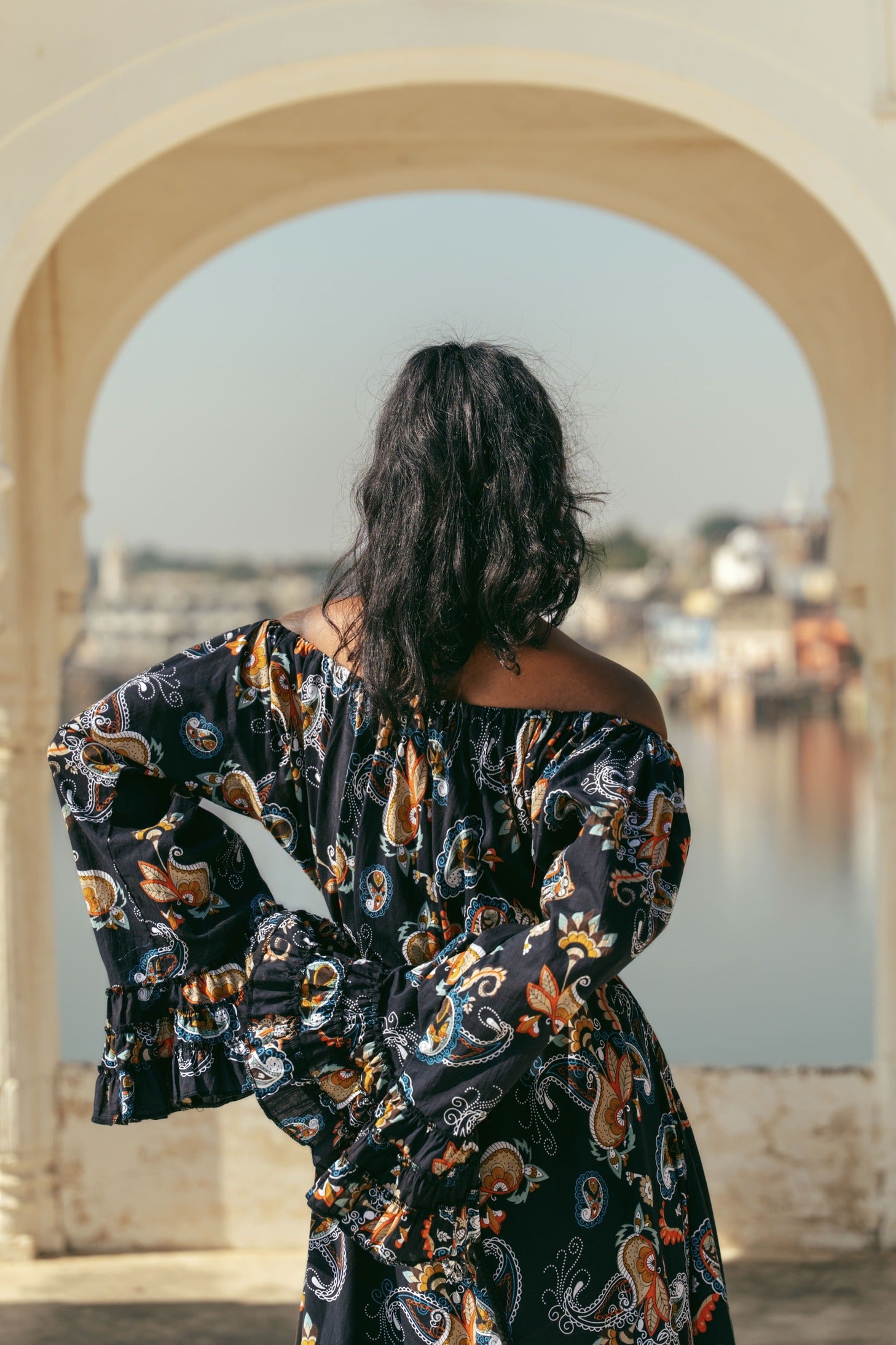 Deze bohemian jurk komt in heel veel unieke prints en is ideaal als festival jurk, Ibiza jurk of als dagelijkse flowy favorite. Je kunt de jurk off-shoulder maar ook over je schouders dragen! In de halsboord zit elastiek.