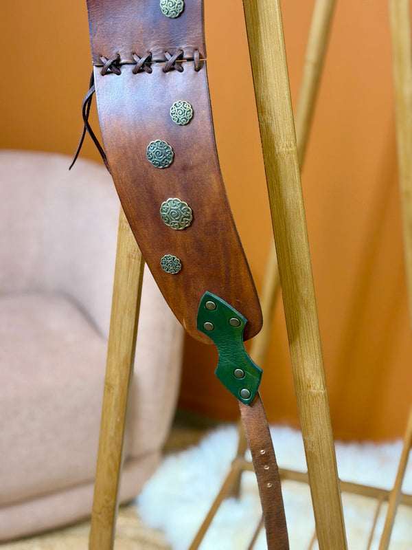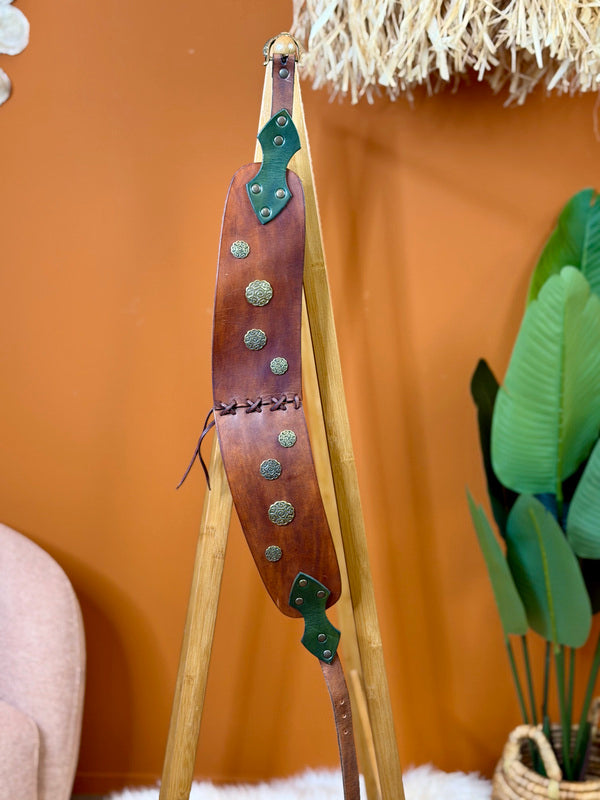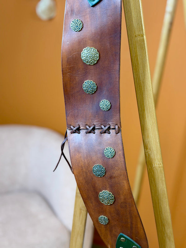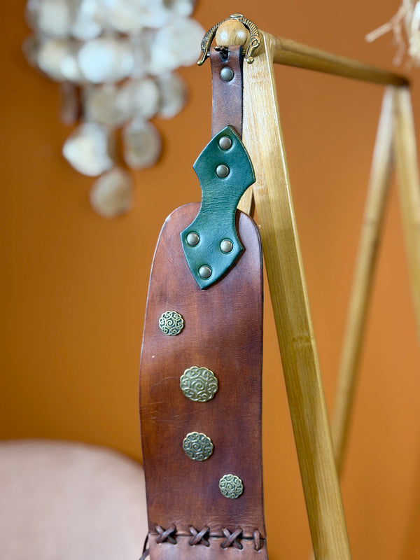 Met de hand gemaakt van stevig leer, rijk versierd met antieke studs en details in donkergroen leer.