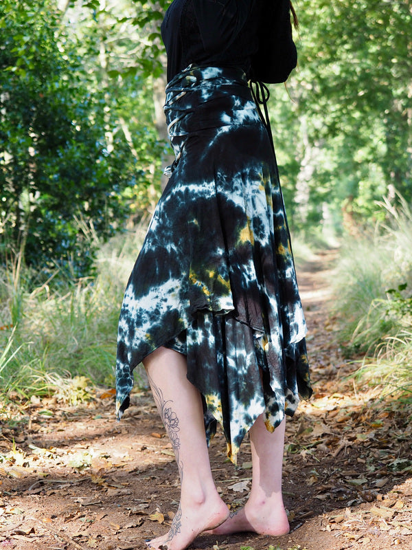 Elke rok is met de hand getiedyed, waardoor geen enkel exemplaar hetzelfde is – jij draagt dus écht een one-of-a-kind. Het pixie model met speelse punten laat je vrij bewegen en geeft je outfit een magische, eigenzinnige uitstraling. Je draagt deze rok hoog in de taille!