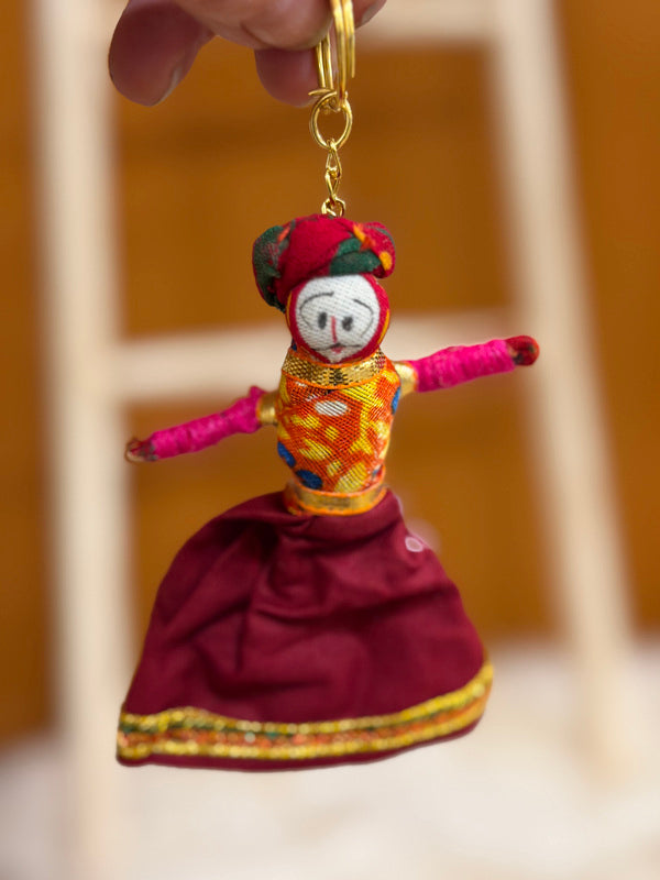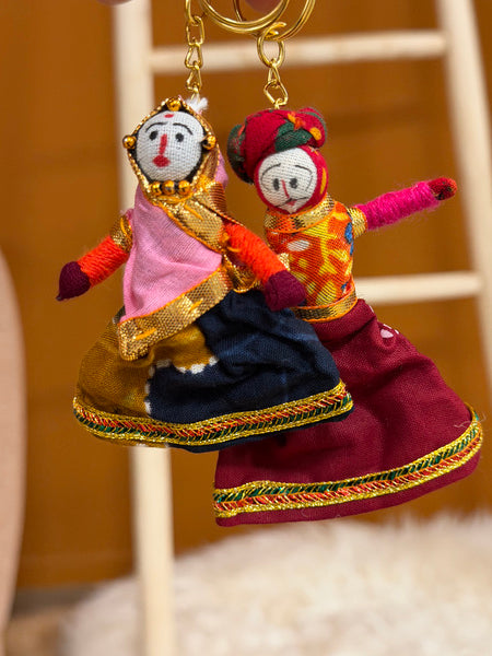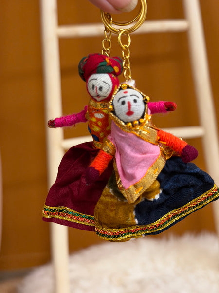 Deze dubbele sleutelhanger is zó veel meer dan een accessoire. Twee kleine, handgemaakte poppetjes, gekleed in traditionele Indiase kleding, samen verbonden — alsof ze een eigen verhaal fluisteren. Hun armpjes zijn beweegbaar, wat ze nog levendiger en speelser maakt.