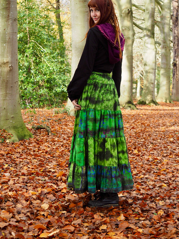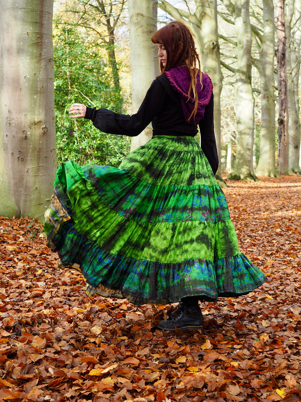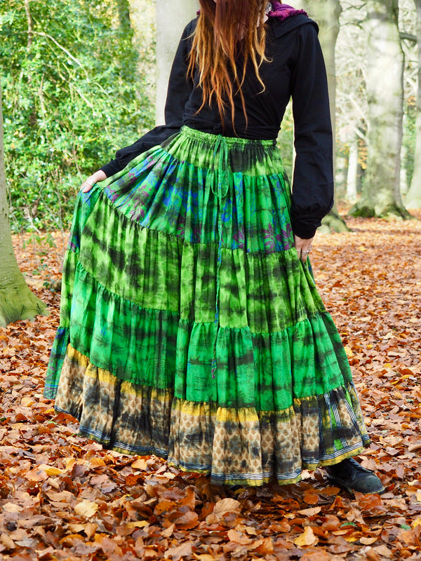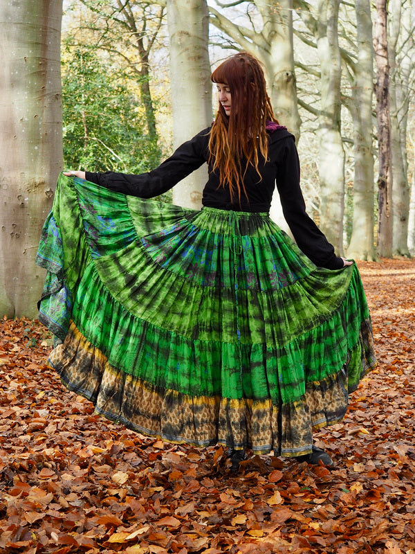 Ontdek onze Zijden Gypsy rok – een bizar gave, ultravrouwelijke lange bohemian rok gemaakt van upcycled vintage sari zijde en TieDye geverfd. Elk stuk is volledig uniek, kleurrijk en handgemaakt in India. 🌺