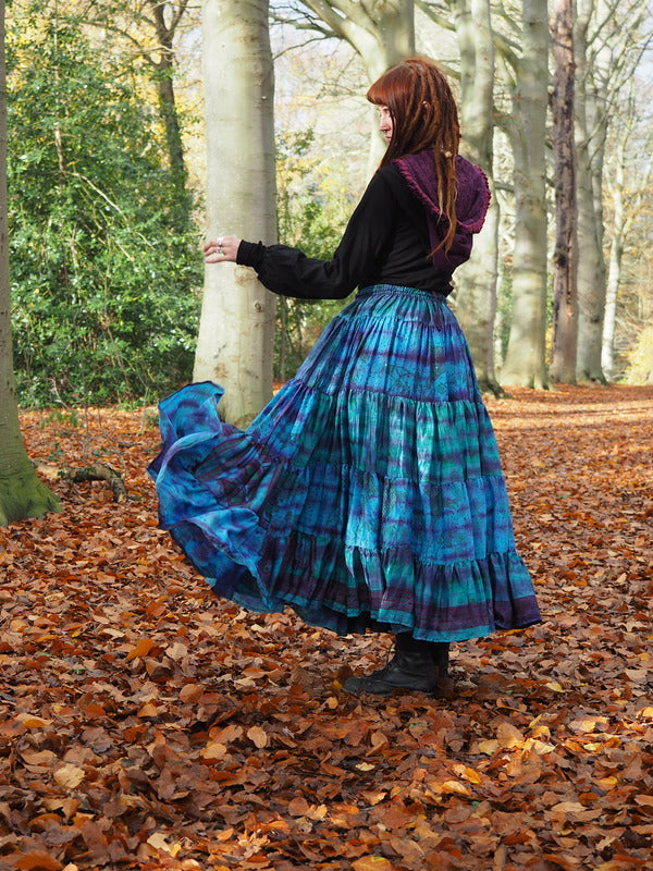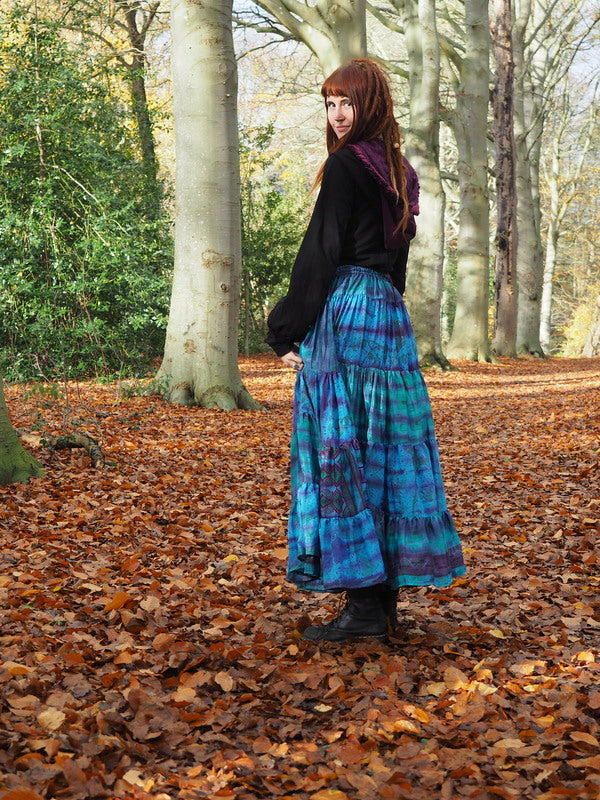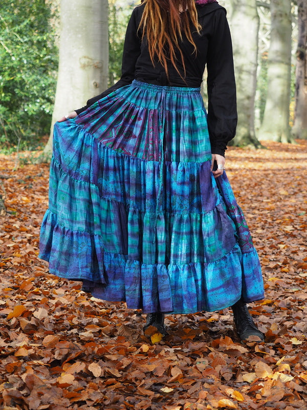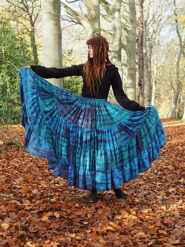 Ontdek onze Zijden Gypsy rok – een bizar gave, ultravrouwelijke lange bohemian rok gemaakt van upcycled vintage sari zijde en TieDye geverfd. Elk stuk is volledig uniek, kleurrijk en handgemaakt in India. 🌺