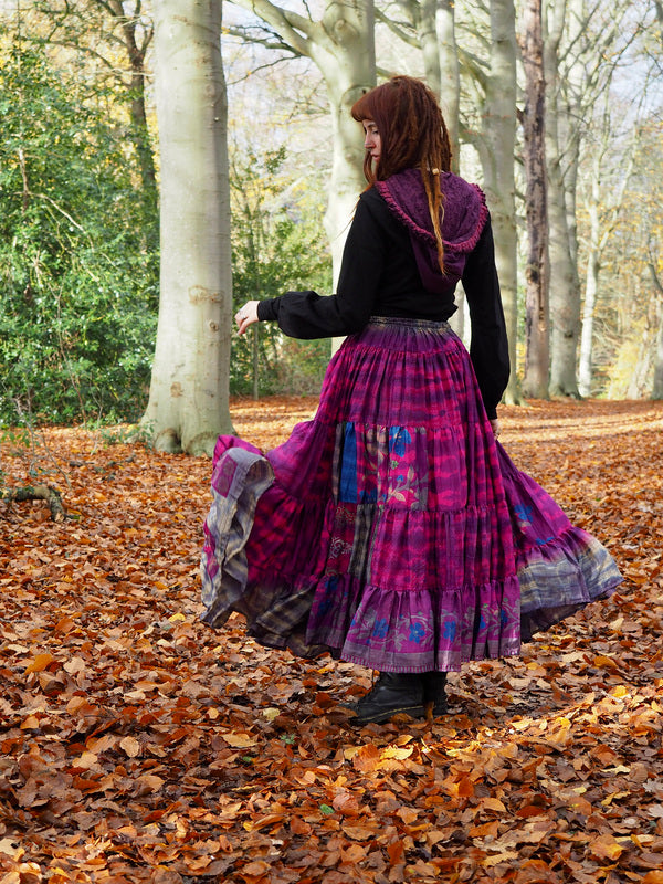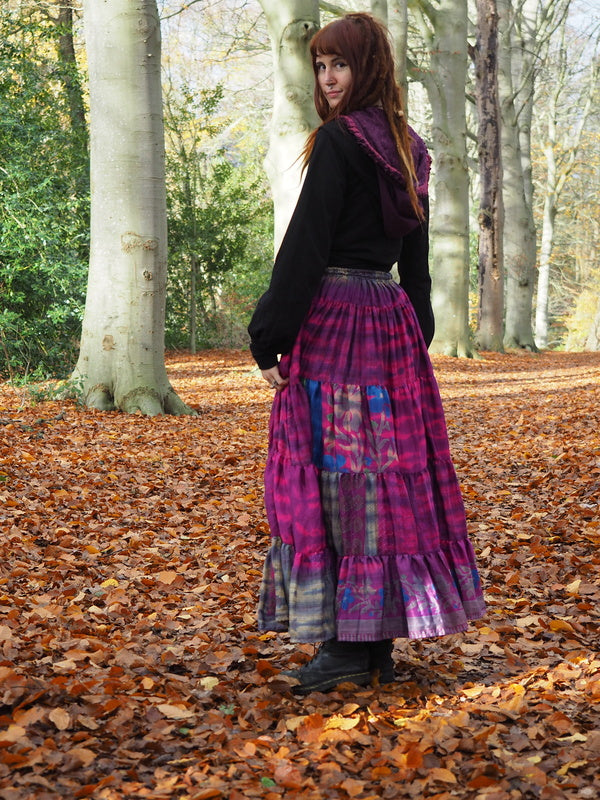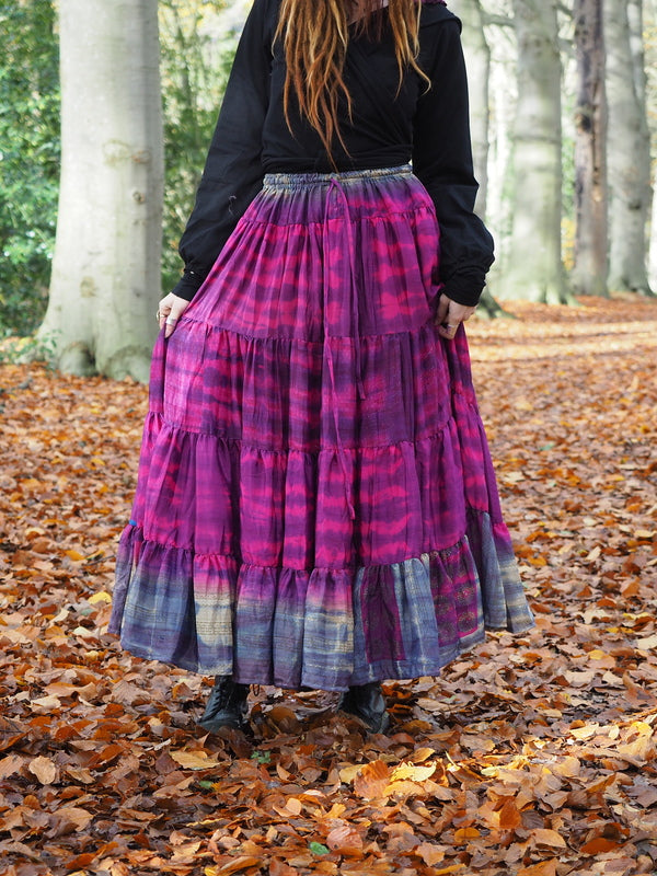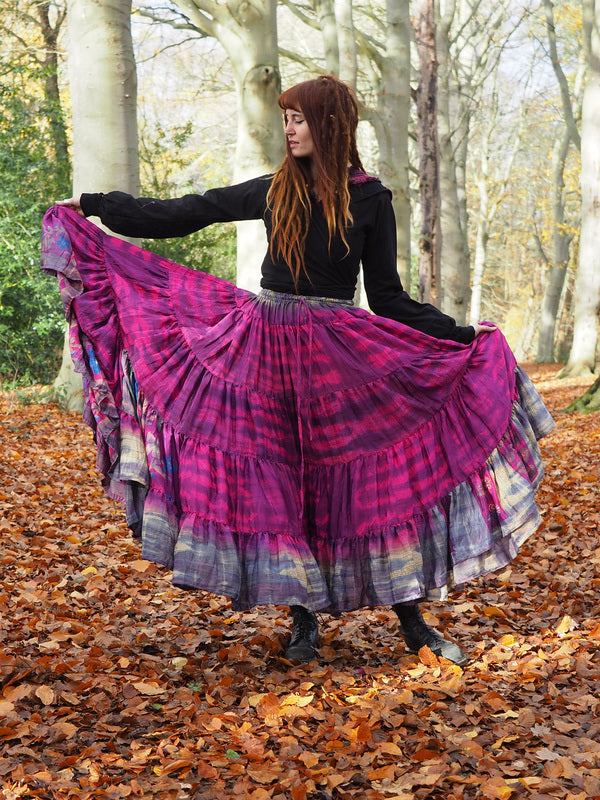 Ontdek onze Zijden Gypsy rok – een bizar gave, ultravrouwelijke lange bohemian rok gemaakt van upcycled vintage sari zijde en TieDye geverfd. Elk stuk is volledig uniek, kleurrijk en handgemaakt in India. 🌺