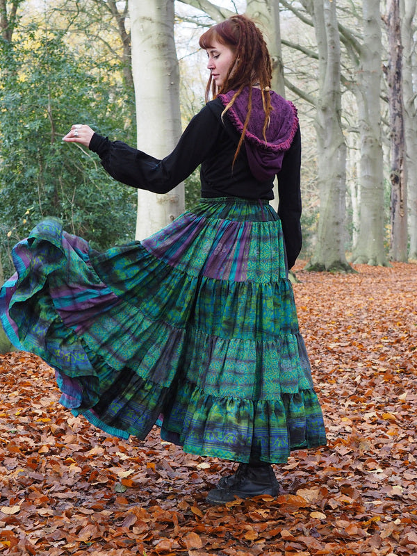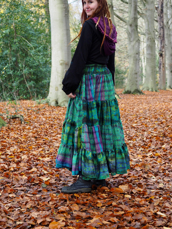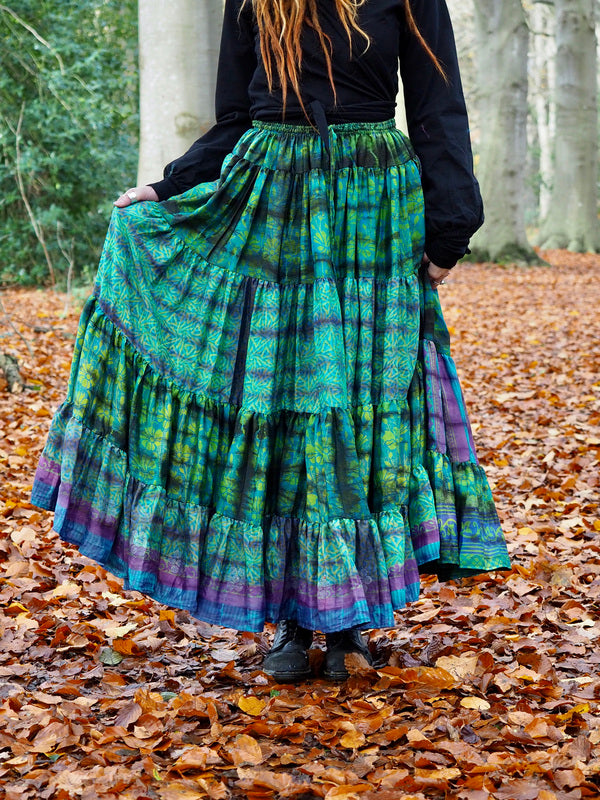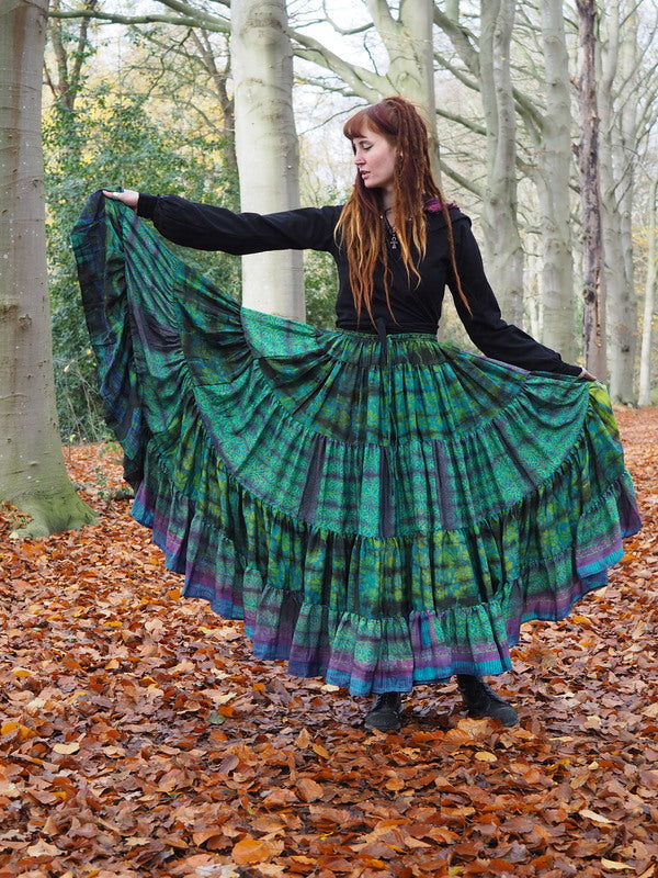 Ontdek onze Zijden Gypsy rok – een bizar gave, ultravrouwelijke lange bohemian rok gemaakt van upcycled vintage sari zijde en TieDye geverfd. Elk stuk is volledig uniek, kleurrijk en handgemaakt in India. 🌺