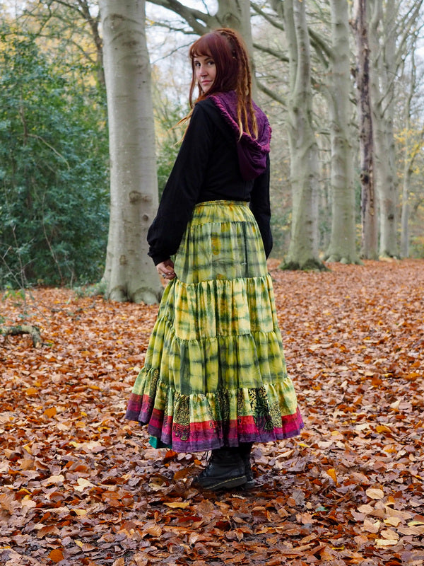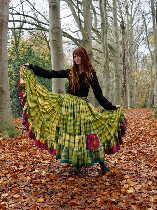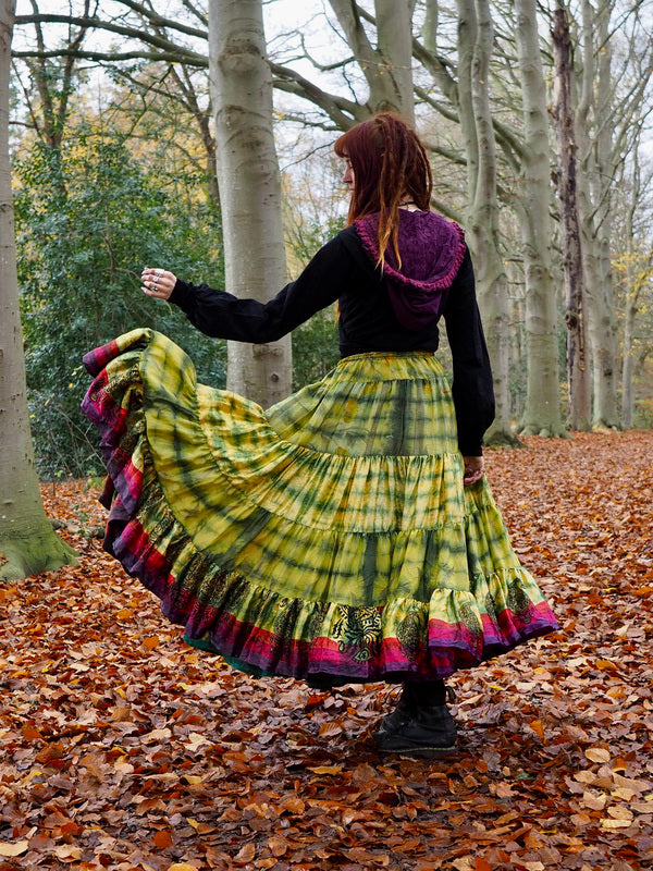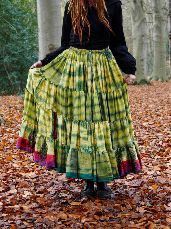 Ontdek onze Zijden Gypsy rok – een bizar gave, ultravrouwelijke lange bohemian rok gemaakt van upcycled vintage sari zijde en TieDye geverfd. Elk stuk is volledig uniek, kleurrijk en handgemaakt in India. 🌺