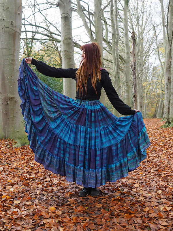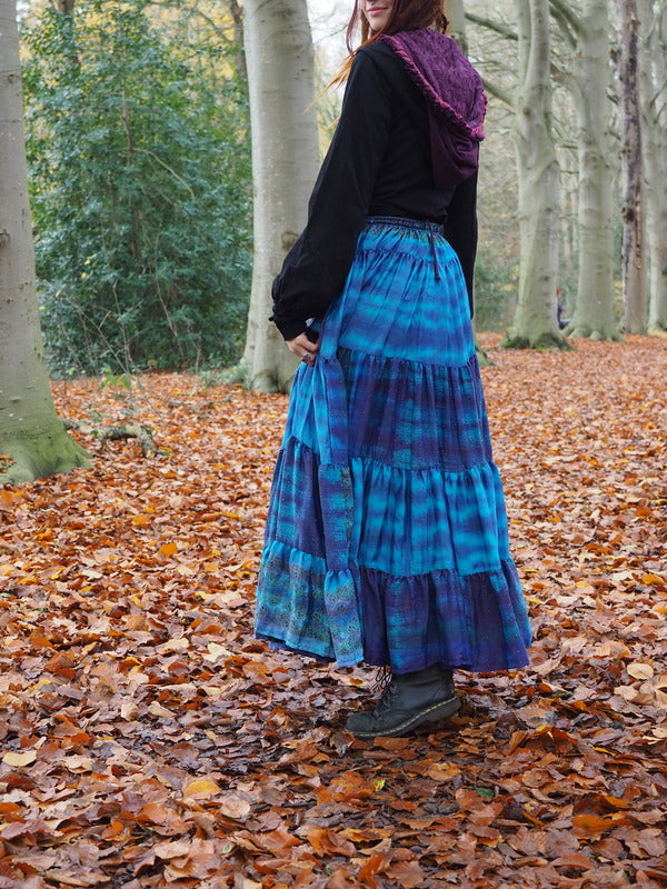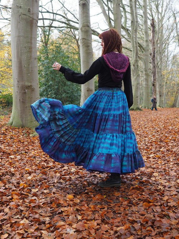Ontdek onze Zijden Gypsy rok – een bizar gave, ultravrouwelijke lange bohemian rok gemaakt van upcycled vintage sari zijde en TieDye geverfd. Elk stuk is volledig uniek, kleurrijk en handgemaakt in India. 🌺