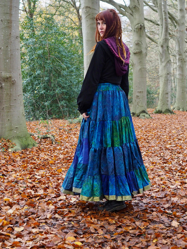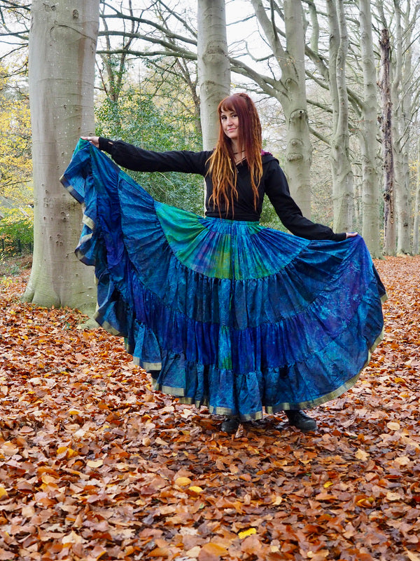 Ontdek onze Zijden Gypsy rok – een bizar gave, ultravrouwelijke lange bohemian rok gemaakt van upcycled vintage sari zijde en TieDye geverfd. Elk stuk is volledig uniek, kleurrijk en handgemaakt in India. 🌺