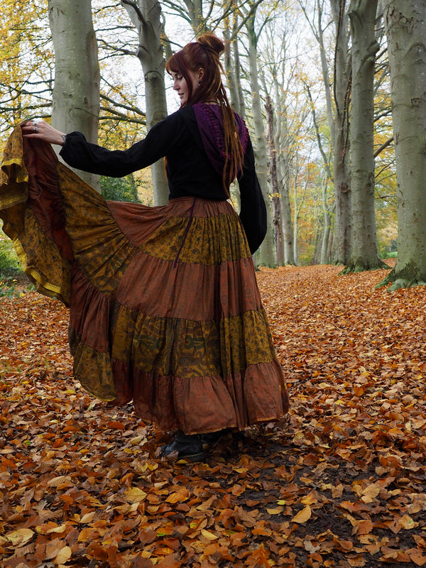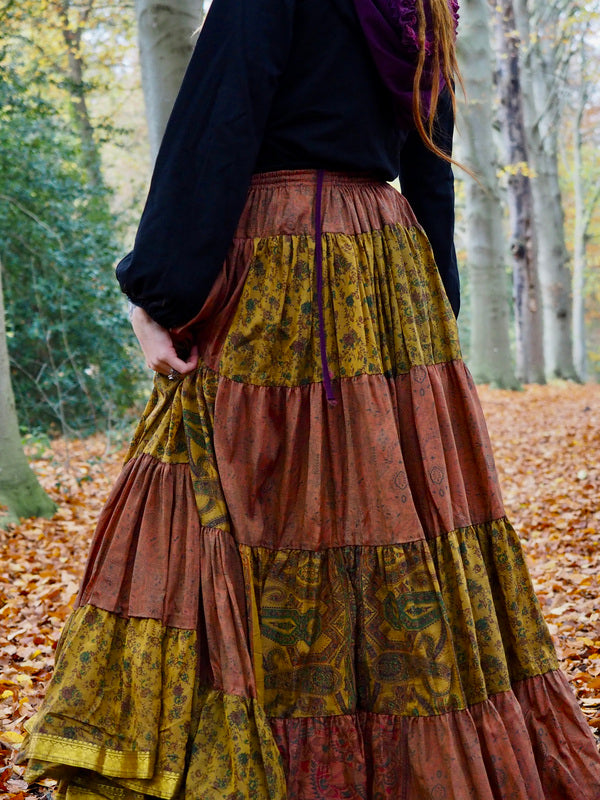 Zijden Gypsy rok Bizar gave vrouwelijke Gypsy, Bohemian kleurrijke rok gemaakt van Upcycled Sari Zijde. Ontzettend mooi! Door de lichtval is de kleur van de... Lees meer