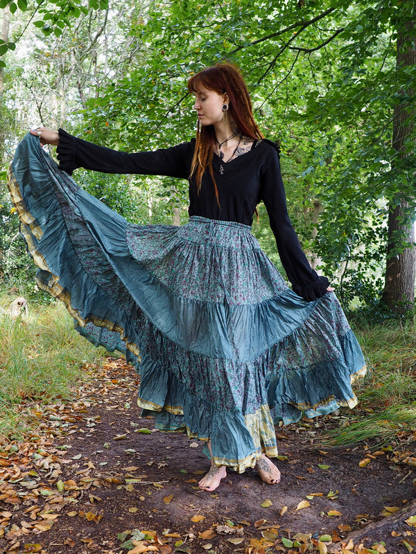 Al onze zijden rokken zijn gemaakt van Upcycled Sari’s, vintage Sari’s, dat betekent dat deze Sari’s gedragen zijn door een Indiase vrouw. Zo leeft haar Spirit door in deze waanzinnige mooie rokken.