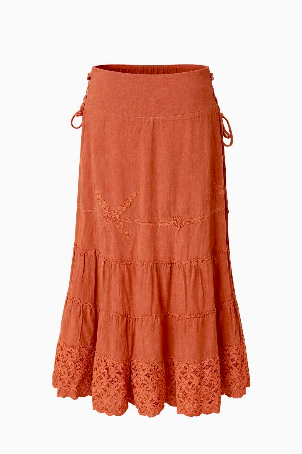 Met zijn betoverende charme van romantisch kant, nostalgische stroken en prachtig borduursel, combineert deze rok moeiteloos het verleden met een eigentijdse stijl.