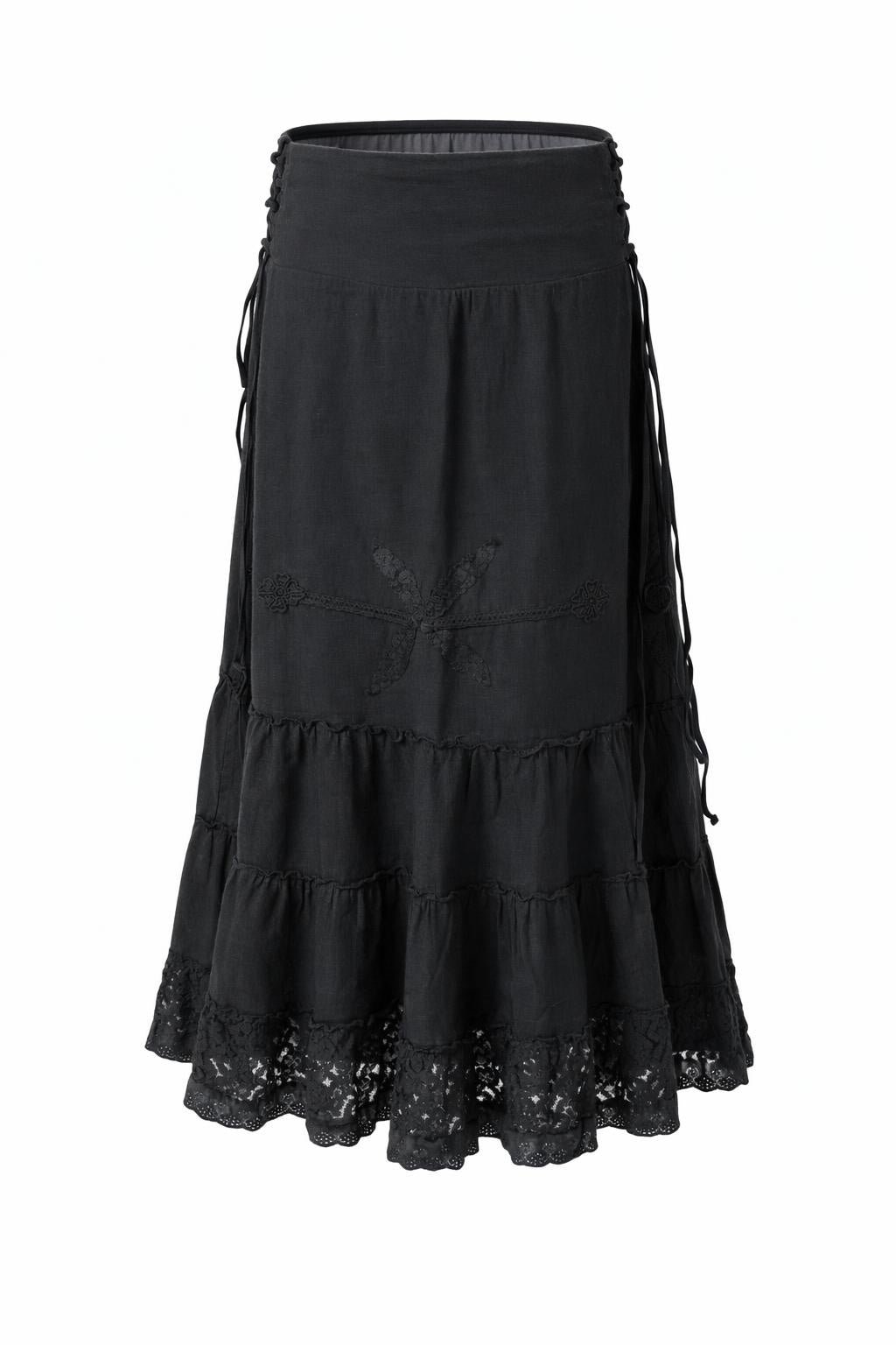 Met zijn betoverende charme van romantisch kant, nostalgische stroken en prachtig borduursel, combineert deze rok moeiteloos het verleden met een eigentijdse stijl.